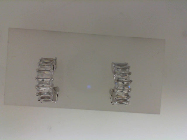 Lady's White Sterling Silver Small Hoop Earrings With Baguette Cubic Zirconiums