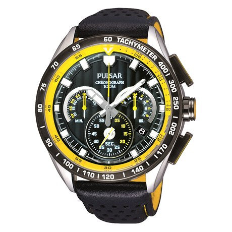 Chonograph with instant zero reset, 1/5th second stopwatch measures elapsed time up to 60 minutes; Date calendar; Luminous hands and markers; Screwdown caseback; 100M water resistant