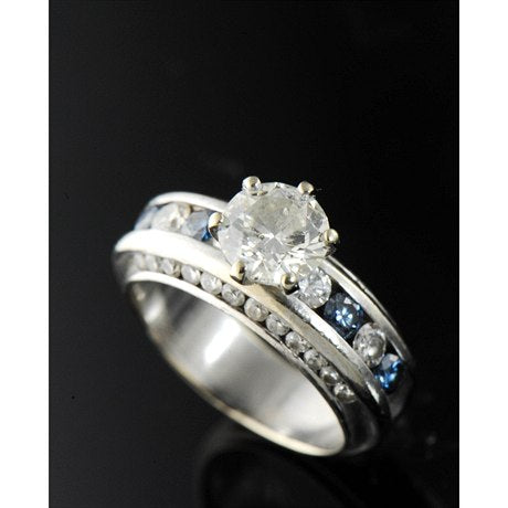 This ring is pictured with a center round diamond, however the ring does not come with this stone. Call for information for center stones. The sides do have 4 blue diamonds that equils 1/2 cttw.