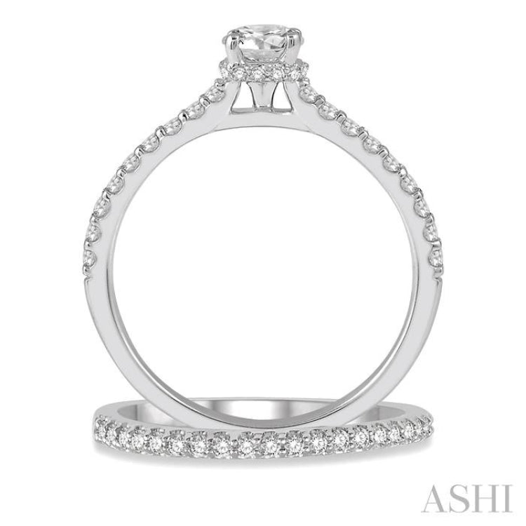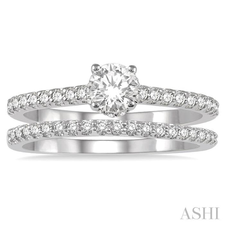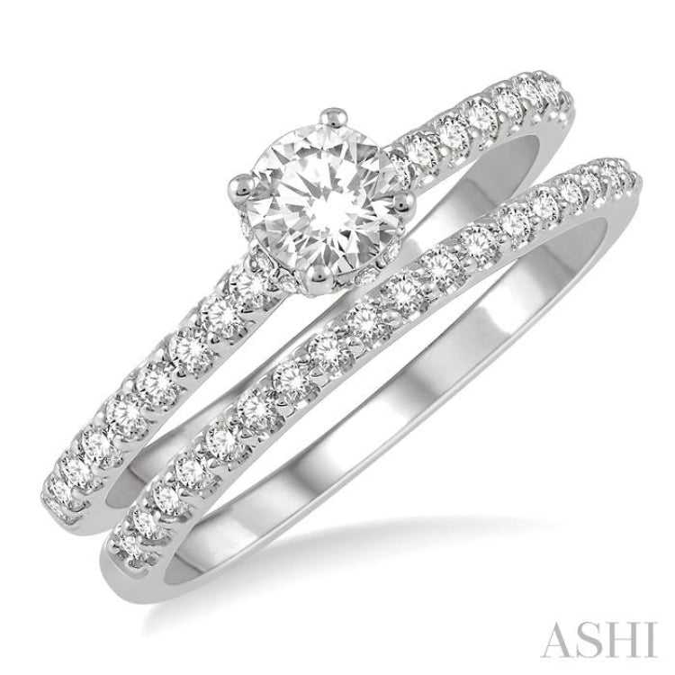 3/4 Ctw Diamond Wedding Set With 5/8 Ct Round Cut Diamond Engagement Ring and 1/6 Ct Wedding Band in 14K White Gold